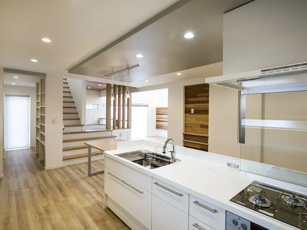 キッチン部にはカウンターを造作したうえ、家事の導線を考慮したパントリーやUTを配置したうえ、上品なアクセントとして天井にグレーのクロスを張り高低差を設けました。