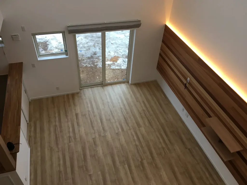 特徴的な明るく大きな吹き抜けのあるリビングの壁面には間接照明付きのテレビボードを増設し、対面に設けた小上がりの畳スペースから家族で映画鑑賞が楽しめるよう設計し、また畳の下には大きめの収納スペースを確保しました。